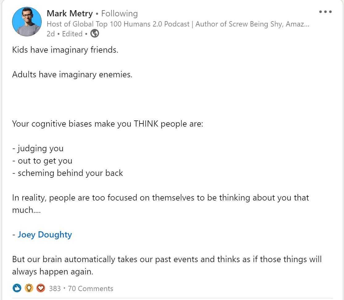 In reality, nobody is actually fixated on your every move and keeping tally of what you are doing. This is a remaining byproduct from when we as humans were living in tribes and our very life depended on our social standing among our fellow members. Today however, nobody cares about what you do, so you shouldn't let that false sentiment limit you in any way.